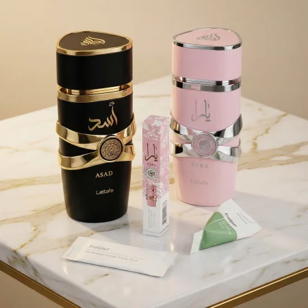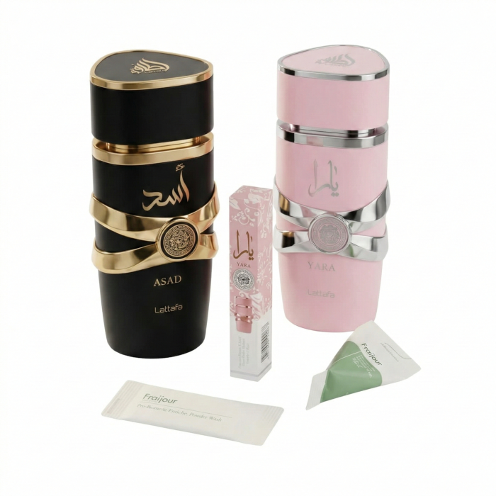 Pachetul include parfumurile originale Lattafa Asad pentru bărbați și Lattafa Yara pentru femei (100ml), alături de trei cadouri bonus: o miniatură Yara de poșetă, o spumă de curățare facială și mostre de exfoliant Fraijour Enzyme. Toate produsele sunt 100% autentice, sigilate și provin direct de la producător, oferind un mix complet de parfumerie arăbească și îngrijire a tenului în limita stocului disponibil.