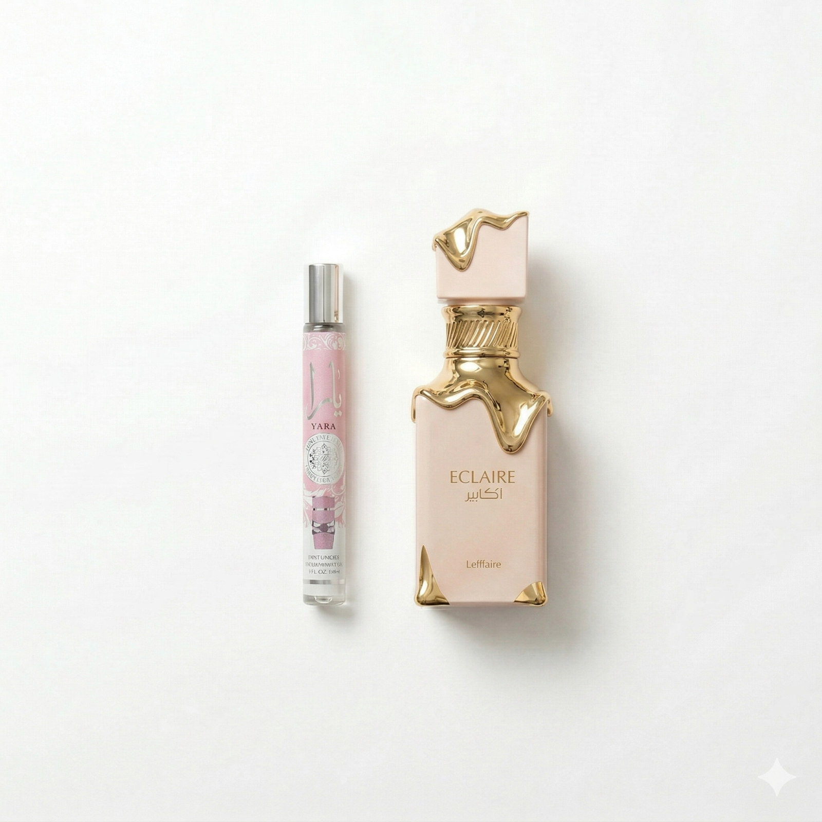 Pachetul Gourmand Glow Parfum Lattafa Eclaire 100ml &Mini Yara de poseta 35ml este experiența supremă de răsfăț, creată special pentru femeia care adoră aromele dulci de caramel sau capsuna . Am reunit cele mai virale produse ale momentului într-un set exclusiv care îți oferă tot ce ai nevoie pentru a străluci si a întoarce priviri,